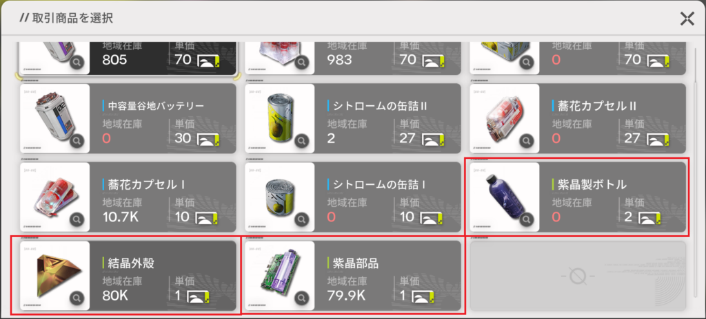 序盤は簡単に作れる「結晶外殻」、「紫晶部品」、「紫晶ボトル」を作るだけで十分です。効率を求めだすと時間も労力もかかりますから、とりあえず序盤はこれらを作って取引するだけでも稼げます。