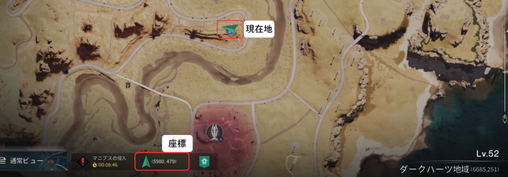 MAPを開くと、下のほうに座標が表示されます。表示されている座標は現在いる場所の座標になります。