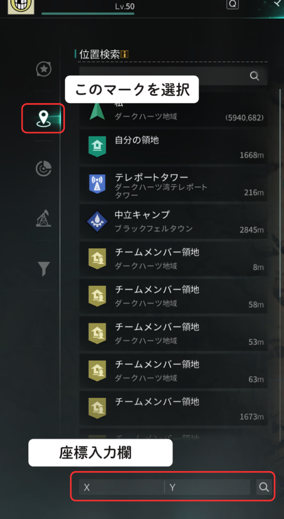 マップを開いたら左のほうにメニューアイコンが表示されていますので、そこで位置検索のマークを選択します。すると下部のほうに座標入力の欄が表示されます。