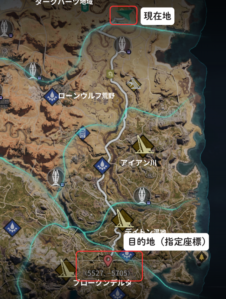 先ほどの座標入力欄を選択し、目的地である座標を入力してください。その後検索を実行(虫眼鏡ボタン、エンターキー、座標入力欄の上あたりをクリック)すると、座標にピンがささり、ルートが表示されます。なお、コピーした座標を貼り付けすることはできますが、X軸とY軸は別々に貼り付けする必要ありますのでご注意ください。