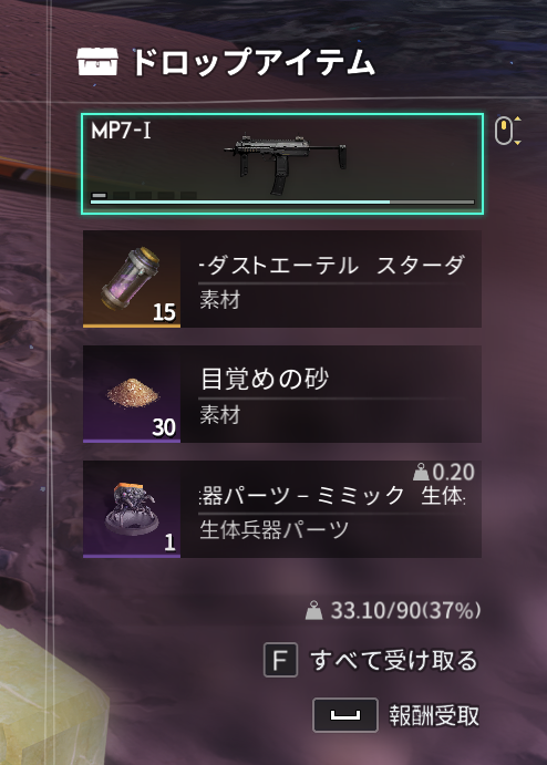 見つけたミミックを攻撃し続け、倒しましょう。倒すと以下のように報酬がもらえます。なお、生体兵器パーツ(ミミック)が入手できるかどうかはランダムです。(体感50%はありそう)