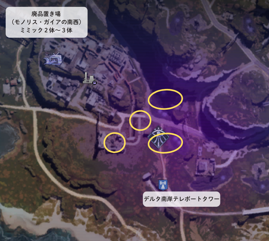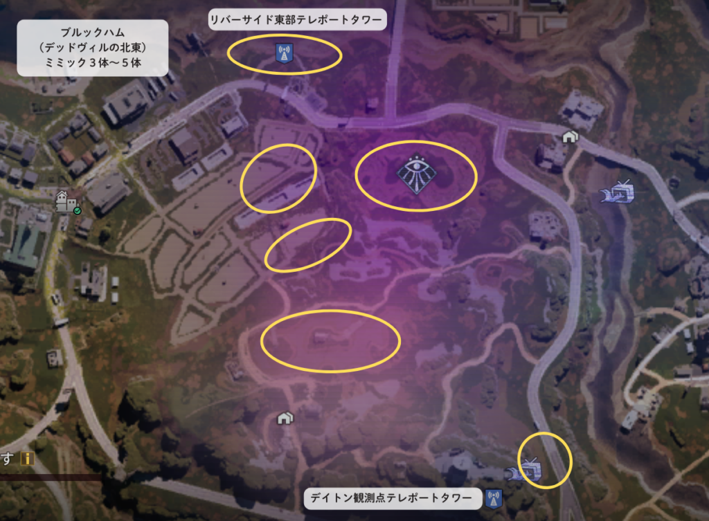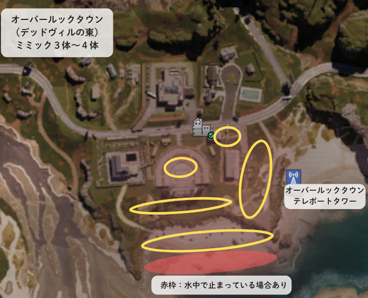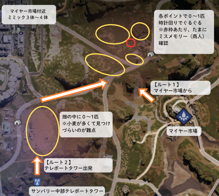 ミミックがよくみつかる場所を「黄枠」にしました。いないこともありますので、余裕があれば走り回ってみてください。特に「リバーサイド東部テレポートタワー」付近は2匹いることがあるので、時間がないときはそこだけ見るのがおすすめです。