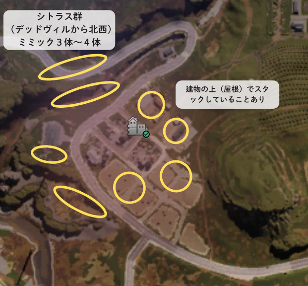 ミミックがよくみつかる場所を「黄枠」にしました。いないこともありますので、余裕があれば走り回ってみてください。たまに、建物の屋根にいることがあるので、建物の屋根も注目してみてください。