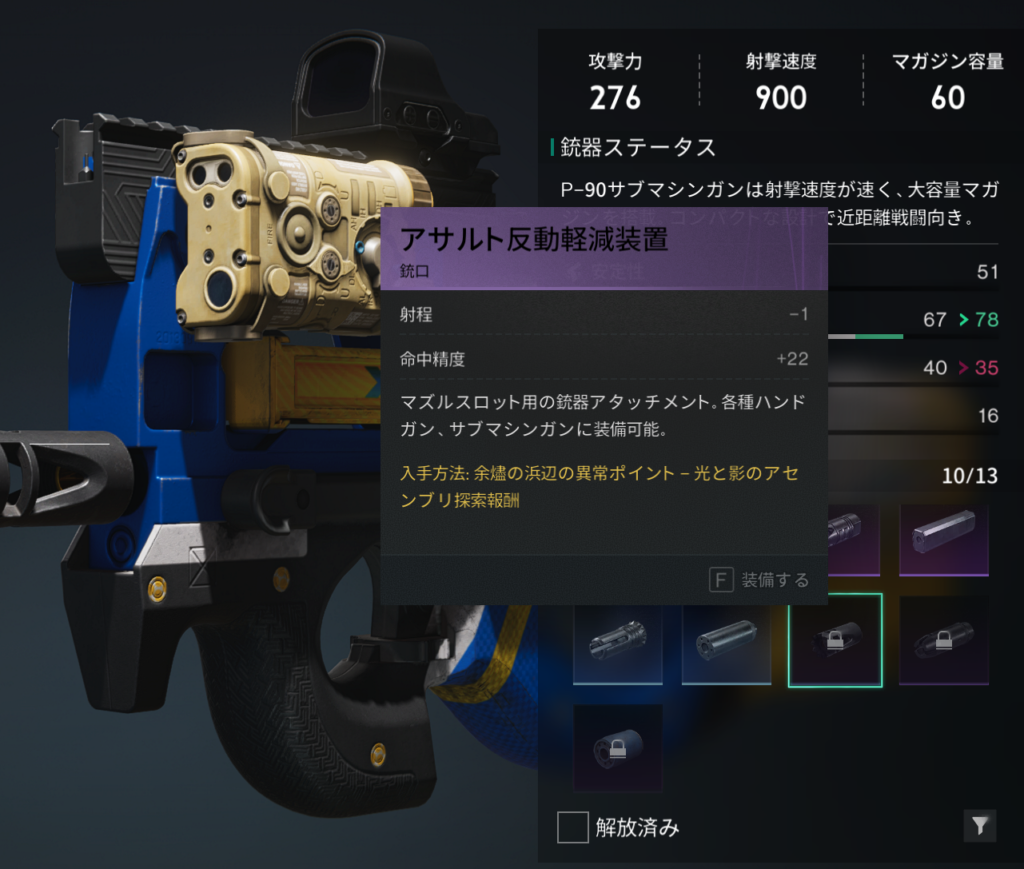 アタッチメントは銃器のカスタマイズとしてはかなり重要なパーツとなります。扱いやすさが変わりますので、ぜひ集めてみましょう。なお1度入手するとサブキャラクターでも使えます。(アカウント内共通)