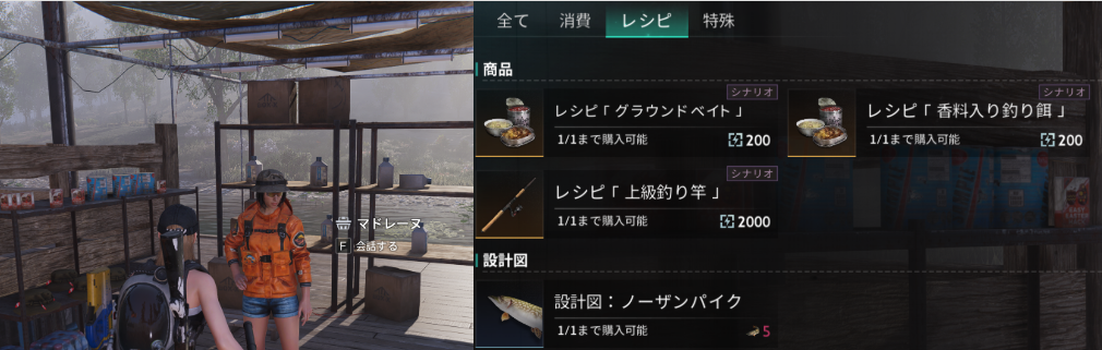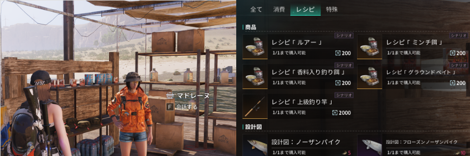 - Lローンウルフ荒野北東、釣り場のマドレーヌさんが売ってくれます。